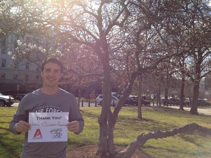 From the Capitol, we ran through the National Mall. The mild winter has resulted in an early bloom for many of the trees in the area. DC is well-known for its cherry blossoms, and we were able to see the beginning of the bloom. Here, I was able to thank Neil & Suzanne Alexander. One of the biggest surprises from my trip was becoming connected to Neil and his family. Neil lives in Pittsburgh and was diagnosed with ALS in June. When learning about Lou Gehrig’s battle with ALS, the constant theme you hear is how positive he was throughout his battle. His “luckiest man” speech reflects his attitude. Neil has taken the same approach as he fights this disease. Read this article about Neil. He and his family have also started Live Like Lou. Neil, thanks for your words of encouragement along the way. I look forward to getting to know you more.