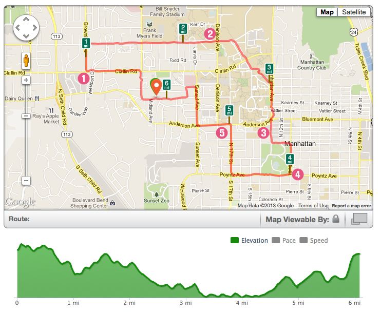 We started our run near our home–a charming rancher at the top of the hill near campus with a secluded backyard and plenty of wildlife–a rare sight in the middle of town. From here we hook a couple of quick turns up another hill, where we make our first stop at my second home in Manhattan.