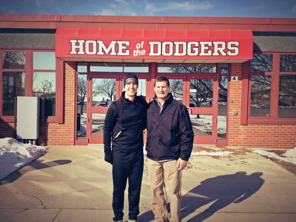 Today’s run started at the Fort Dodge Senior High School, where I met up with my friend Blake Utley. More about Blake later. I was surprised to find that one of my favorite coaches, Rod Riessen, made the trip over to say hi. Coach Riessen was one of my football coaches/P.E. teaches in high school. I learned two very important lessons from Coach Riessen or “Riess” as we called him. 1) I learned what happens when you assume things (I think you all probably know the play on words), and 2) Never underestimate the value of an Australian push-up. I will also never forget the day of my first varsity football practice. We were doing drills with Coach Riess and I landed awkwardly on my hand. I was shocked to find out that my pinky finger was lodged in a 90-degree angle. I went to Coach Riess and stated, “Coach, I think I broke my f&*#* finger.” He agreed.