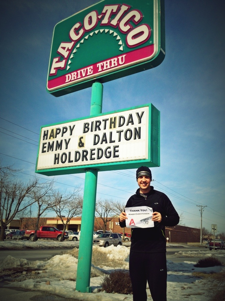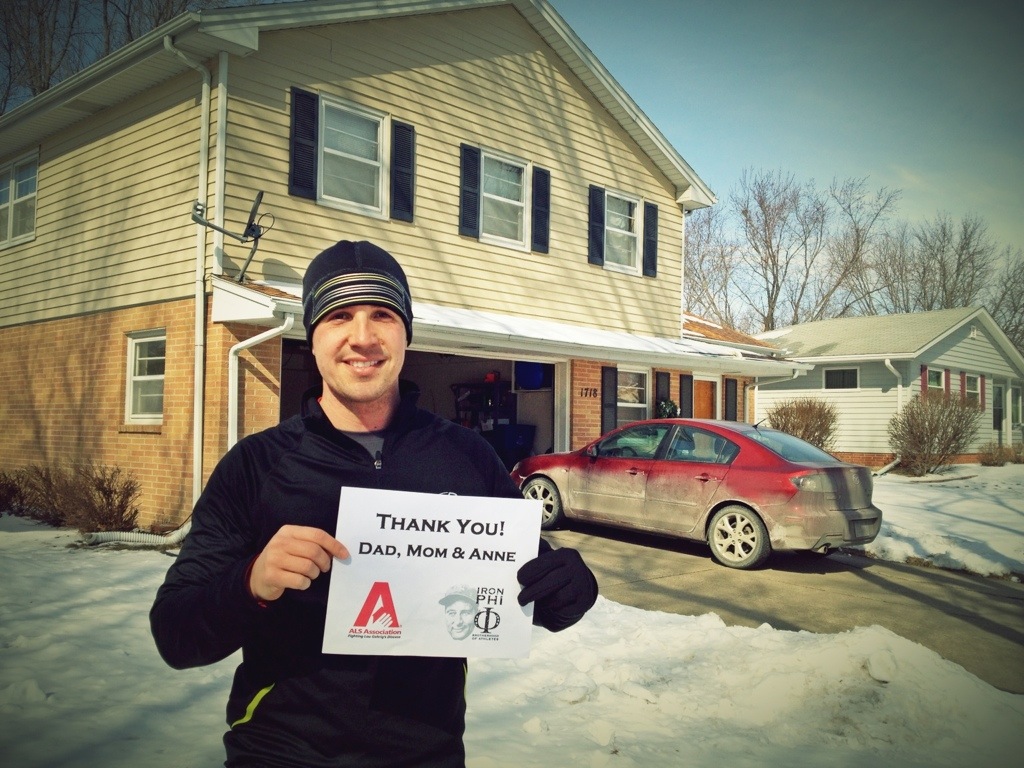 From Blanden, we ran to the next Runner’s Choice, one of the finest establishments in town, in which I will never admit to entering. Welcome to the Top Hat Lounge. Let’s just say that the Top Hat is a place where you can get a drink and watch a dance at the same time. I’m not talking about the March Madness Big Dance either. Here, I thanked Roger Griffith, who I consider my second father. I mistakenly added his very innocent wife Paula on the sign before realizing that it probably wasn’t the best of ideas to thank Paula, who I consider my second mother at the local strip club. Paula and Roger are the parents of my best friend Travis. I probably spent just as much time at the Griffiths growing up as I did at my own home. Come to think of it, I probably owe the Griffiths a gift card from Hy-Vee for a couple thousand dollars. Paula & Roger, thanks for your donation, and Roger, shame on you for not telling me that the Top Hat is a strip club 😉 You’ll be happy to know that your donation will be going to the cause and was not turned into twenty-five one-dollar bills. Ok, I’m moving on before I get into trouble.