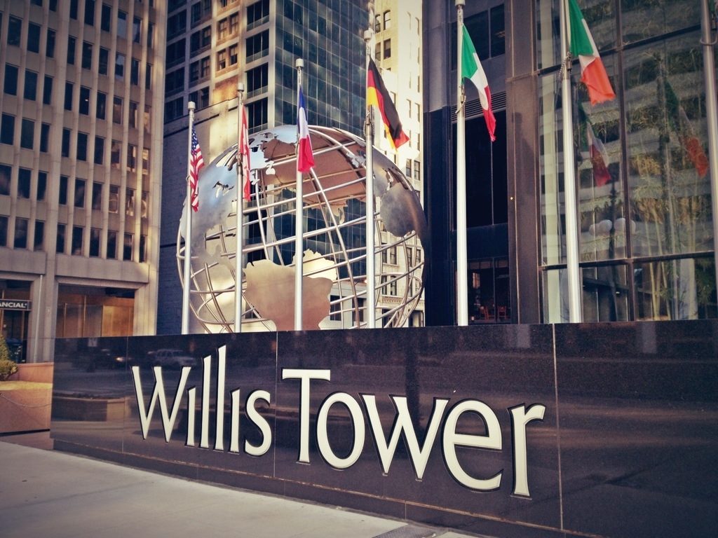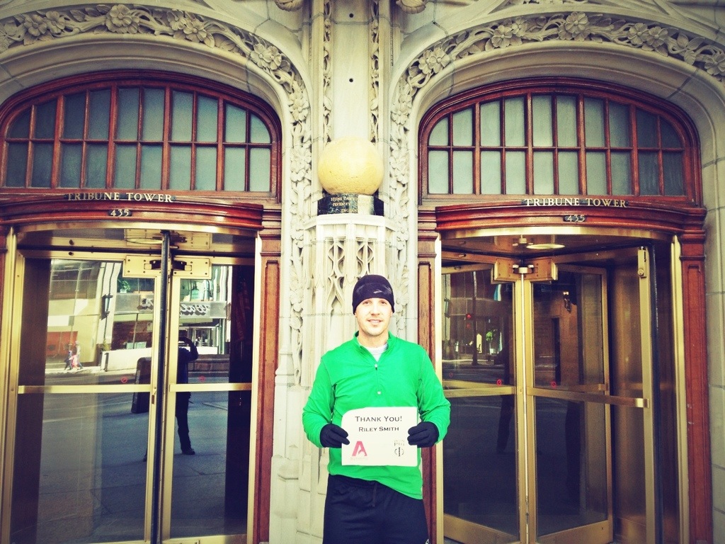 We then ran to Willis Tower, formerly the Sears Tower. I remember going to the top of the tower as a young chap with my dad on our first father-son trip. Here I thanked my running buddy Andy. I probably should have just taken the picture of him holding the sign. We ran to the front of the building to check out the grand entrance.
