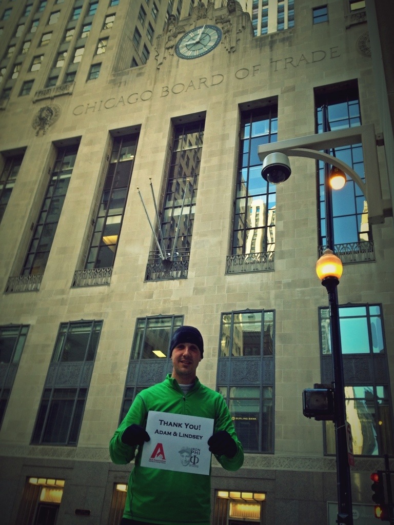 From Willis, we headed to the Chicago Board of Trade where I thanked my cousins Adam & Lindsey Good. Tillie and I are pumped that these two have recently moved to Ames. Adam and I are about a month apart in age, and we both have a very strong love for the Iowa State football tailgate. You can generally find us either filled with optimism after a win or licking our wounds after a heartbreaking loss. Either way, we have a good time. Lindsay teaches in the Gilbert School District just north of Ames and Adam is a financial advisor in Ogden and Eagle Grove. It was only fitting that we thanked them in front of the Chicago Board of Trade.