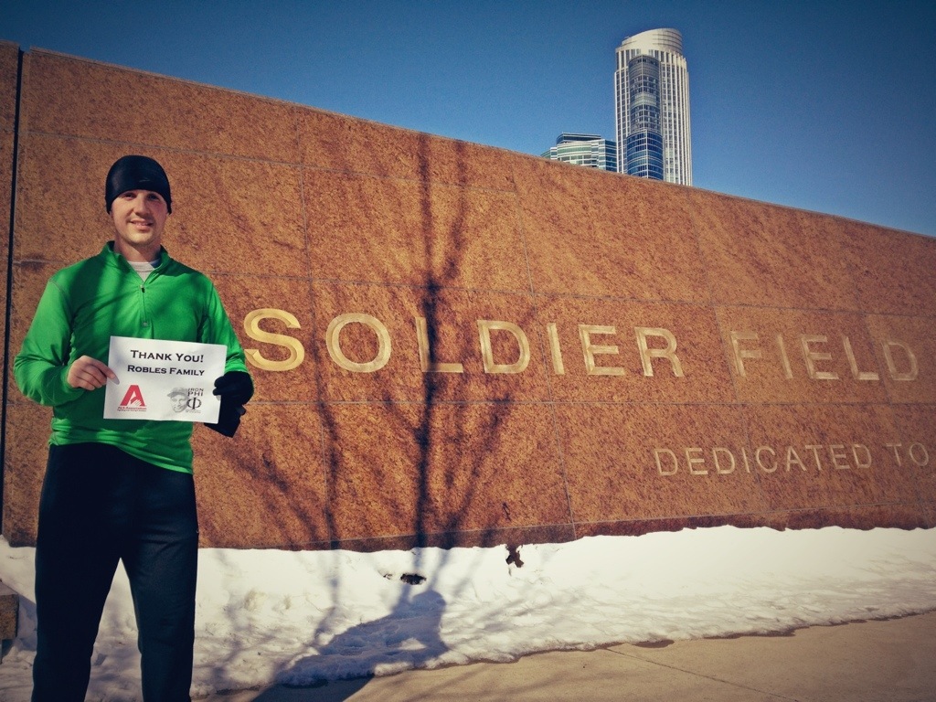 From the Board of Trade, we hurried out of the downtown shade and into the sun to warm up a bit on our way to Soldier Field. On the way, I took the opportunity to take another Runner’s Choice photo at Field Museum, one of Chicago’s many great museums. Here, I thanked the Brannon family. Jason is a fellow Iowa State Phi Delt and has supported my trip both years, and I recently connected with his mother Nancy. She left me a message that mentioned that both her mom and cousin had lost their battle with Lou Gehrig’s disease. I didn’t know the family had that connection. It’s connections like this that completely make this trip worthwhile. I take great pride in representing these families as I run. Serious motivation.