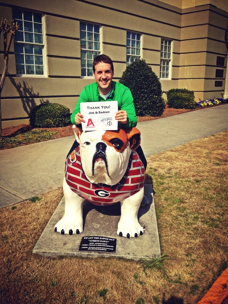 With a full belly, we set out to find my last landmark, Uga the dog. While I was unsuccessful in finding the real Uga (apparently he lives out of town), I was able to find one of many giant statues of Uga throughout town. Here I thanked Tillie and I’s great friends Joe & Sarah Wechsler. Joe and Sarah are two of our favorites, and we were able to meet their little Ben a few months back. We look forward to seeing Cal and Ben grow up together. Happy birthday, Sarah!