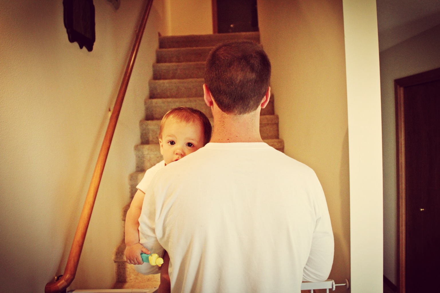 Ranch-style houses have never looked so nice, but if you live in a place with stairs, a wonderful opportunity to build your calves is in front of you. There are two main situations when this exercise can be completed: 1) Your baby has just left his dinner in his pants and you’ve realized that the wipes are upstairs,  or 2) You have a sleeping baby and the quest to get him upstairs to bed without waking him is upon you. Both of these situations start with the same first two steps.