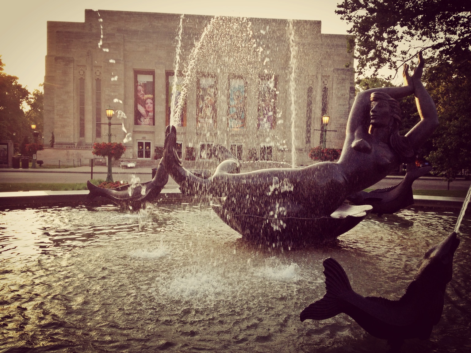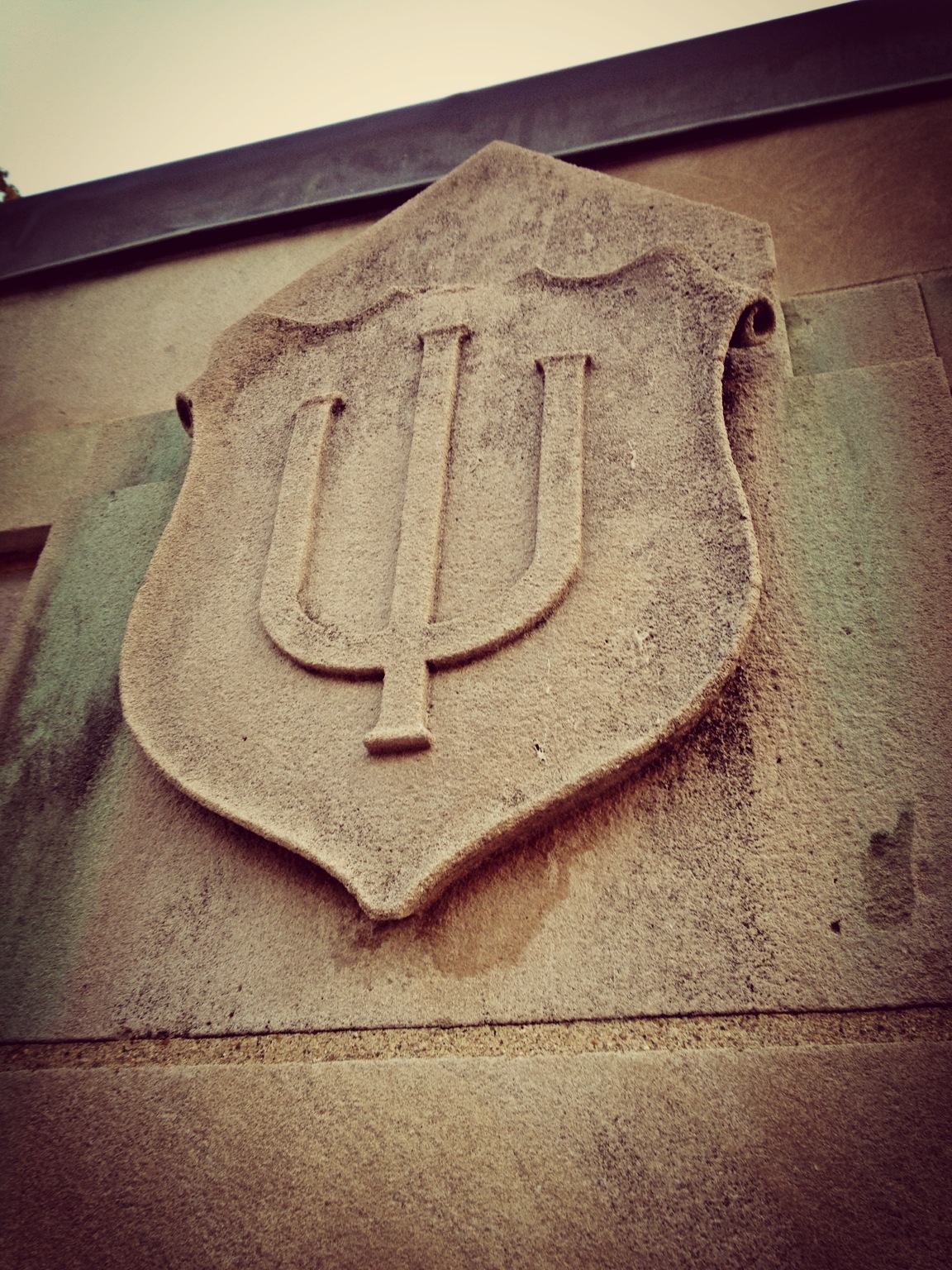 In 1938, during the waning years of the Great Depression and a time when most universities had cut funding for Arts programs, construction began on the IU Auditorium. Indiana University President, Herman B. Wells, used this time to build the world’s top music school, the Lilly Library, the Fine Arts building, and the IU Auditorium. The Auditorium was the first building completely planned and constructed during President Wells’s tenure. It was constructed out of locally quarried Indiana Limestone. The fountains were streaming as we ran past.