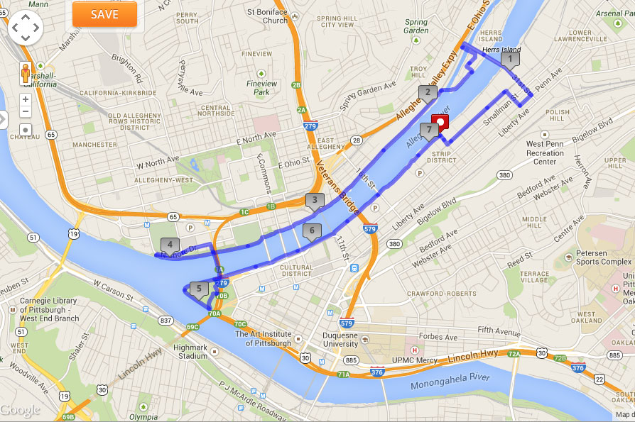 I’m lucky enough to live in the middle of this beautiful city, so I have many running routes, and this is one of my favorites! It’s a 7.1-ish mile loop, and it starts at the Cork Factory’s dog park, on the corner of 25th and Railroad St, in the Strip District. I love animals, and frequently donate to the Animal Rescue League, and actually ran for them at the Pittsburgh Half Marathon in 2012 (I didn’t run it in 2013). I have a dog, Archie (11) and a cat, Mason (15), and I wish everyone got to experience the joy that an animal can bring to your life. Adopt a pet today, and don’t forget to spay/neuter them!