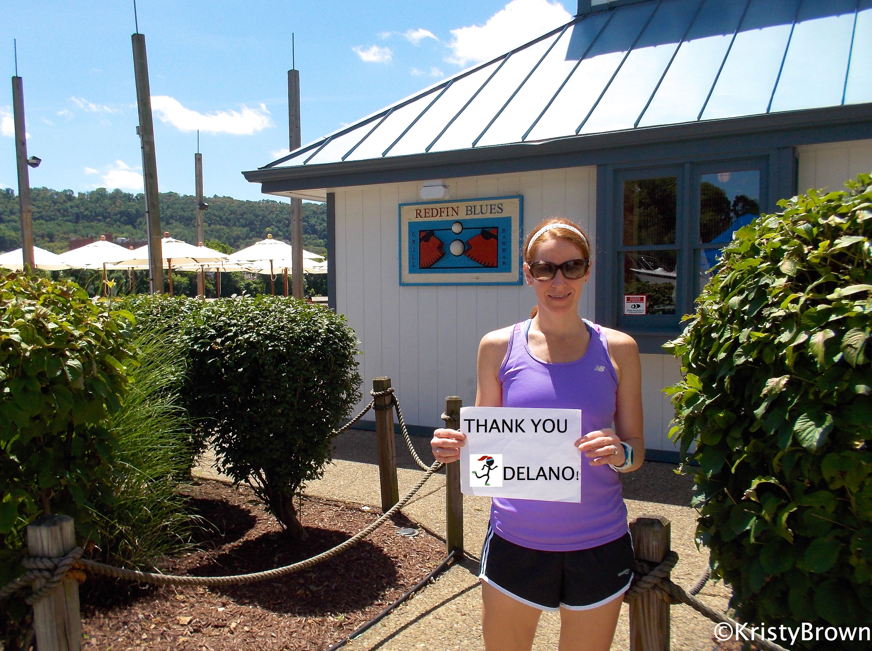 Continue running down the 31st St. bridge, turning left onto Herr’s Island, or Washington’s Landing. Run under the 31st Bridge, to the left of it’s pillar. Here you’ll run across a parking lot, and to the right, you’ll stumble onto one of our favorite places to eat in the summer, RedFin Blues. The restaurant is on the river, and has a dock that offers boaters access. They have a large deck that’s over the river, giving you the option to eat outside, which we always do. This is stop #2. Here I’d like to thank my husband Delano, for his continued love and support in life, and in running. (I know that I’m not always easy to live with). He’s been to almost every race I’ve ran, and was just as excited as me, when I qualified for Boston the first time.