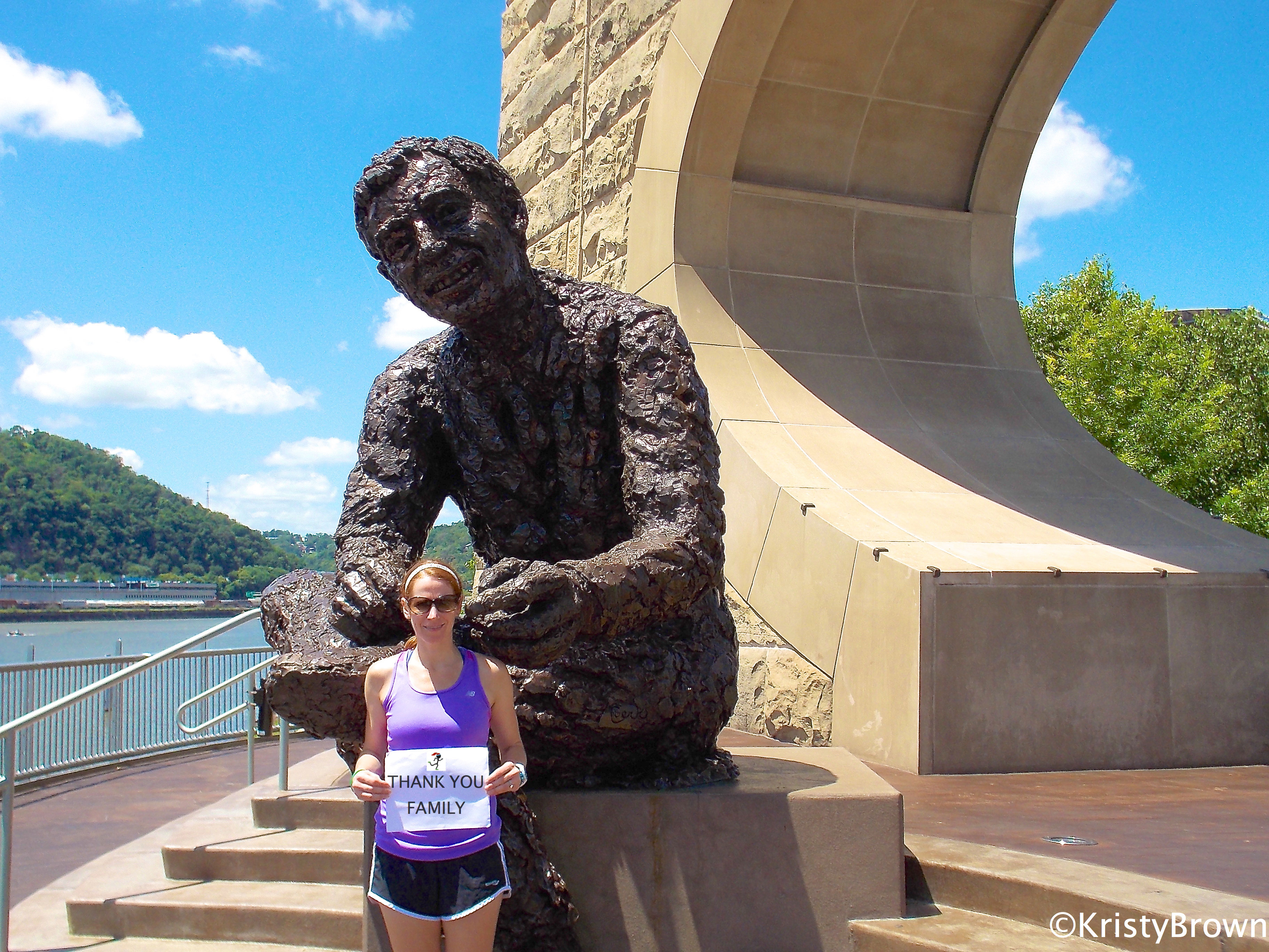 Run passed the memorial, and soon you’ll see an under the road entrance, over to Heinz Field, home of the six time Super Bowl Champions, Pittsburgh Steelers. Continue on the trail, and run up a short hill, and then turn right onto the sidewalk. Soon you’ll find yourself running passed Heinz Field to the left, and you’ll be at the top of the Mr. Rogers Memorial. Walk over to it, for amazing views of the city, Fort Pitt Bridge, and the fountain at Point State Park. This is stop #5, where I’d like to thank the rest of my family. While we don’t always get to see each other as much as we should, it’s nice to know that we’re here for each other.
