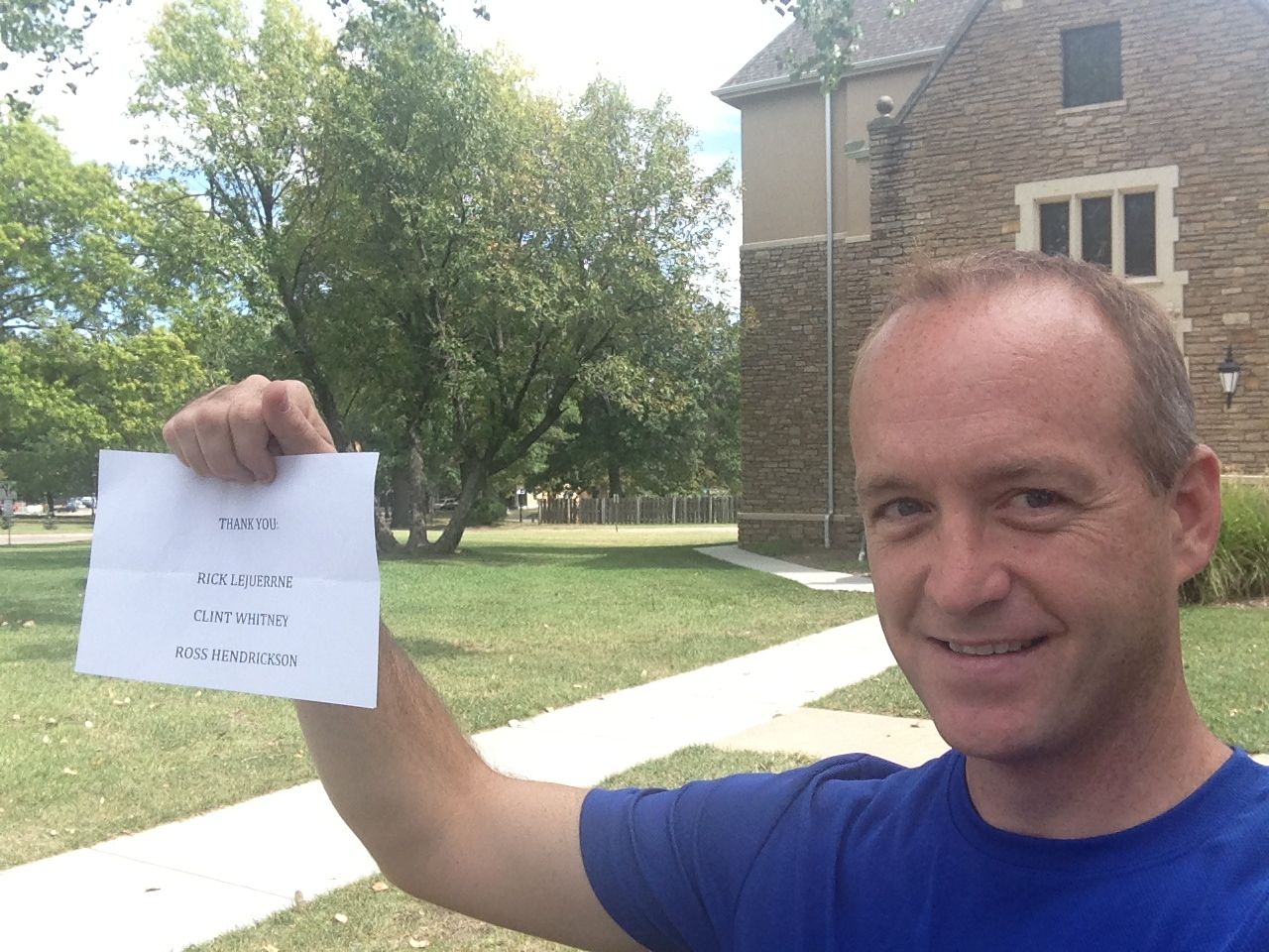 I ran across campus, running the same route that I made for four years on my way to football games and campus events. I paused to take a couple of photos of the new and improved football stadium. As I rounded campus and ran past a few of the sorority houses, I started to rethink my initial plan for my thank you signs. Getting back to what I stated earlier, my initial plan was to spend my run thanking the 10 Kansas National Guard members who gave their lives in service to our country while serving in our two most recent conflicts. As I was trying to take a photo I felt that it was a little too informal for me to hold up names and photos of these 10 heroes. So, I abandoned that plan – not to thank them for their service but to take the photos of me thanking them along the way. Instead, I’m adding all of their names and photos to the end of this blog as a small way of saying thank you for their ultimate sacrifice.