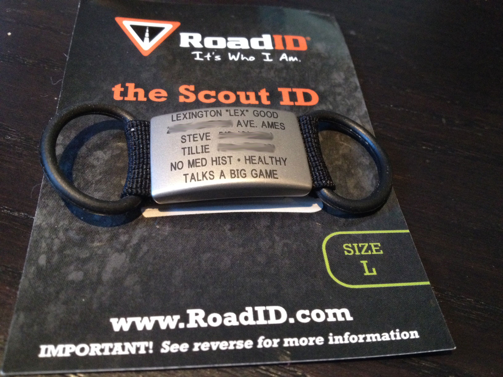 Did I mention the friendly folks at Road ID? They were kind enough to send a Road ID my way for my wrist, and it will (once this shoulder is healed) become a part of my outside running wardrobe. I was able to customize the text with the phone numbers of important people to contact in Ames. I also had to add a little humor to my Road ID. Let’s just hope nobody actually get’s a kick out of it outside of this post! (Click on the image to enlarge)
