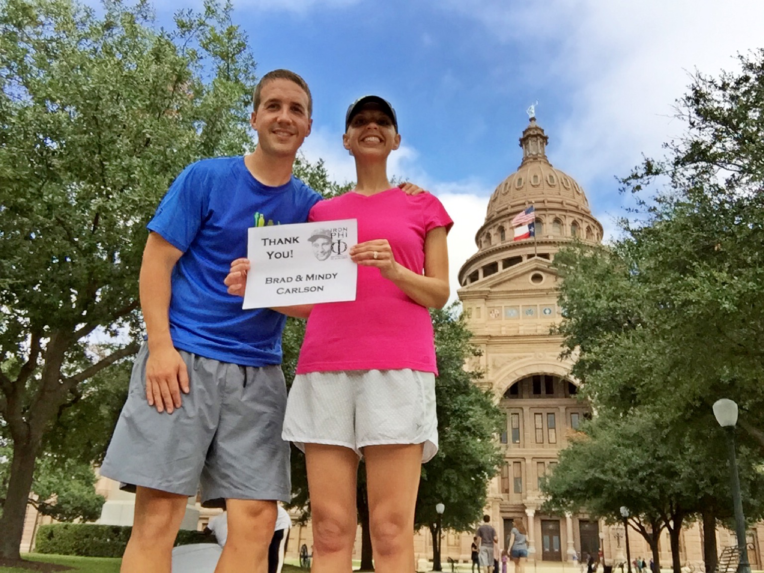 We made our way over to the University of Texas. UT is a culture, and it’s awesome (I just typed that). The school is like no other, and its people are filled with pride. I always love visiting this beautiful campus. Who wouldn’t want to go to school here? (I just typed that) The tower on campus is a source of pride, and unfortunately, it was lit up in burnt orange following their victory over my Cyclones that evening. Here, I thanked my cousins Matt & Jessi Good. Matt & Jessi are great and have been so supportive of me over the years. I had the opportunity to stay with Matt in New York during my first running trip. Jessi recently sent me a shirt from an ALS effort supporting a young man from their hometown, Ogden, Iowa. Wearing it brings a sense of pride every time I put it on.