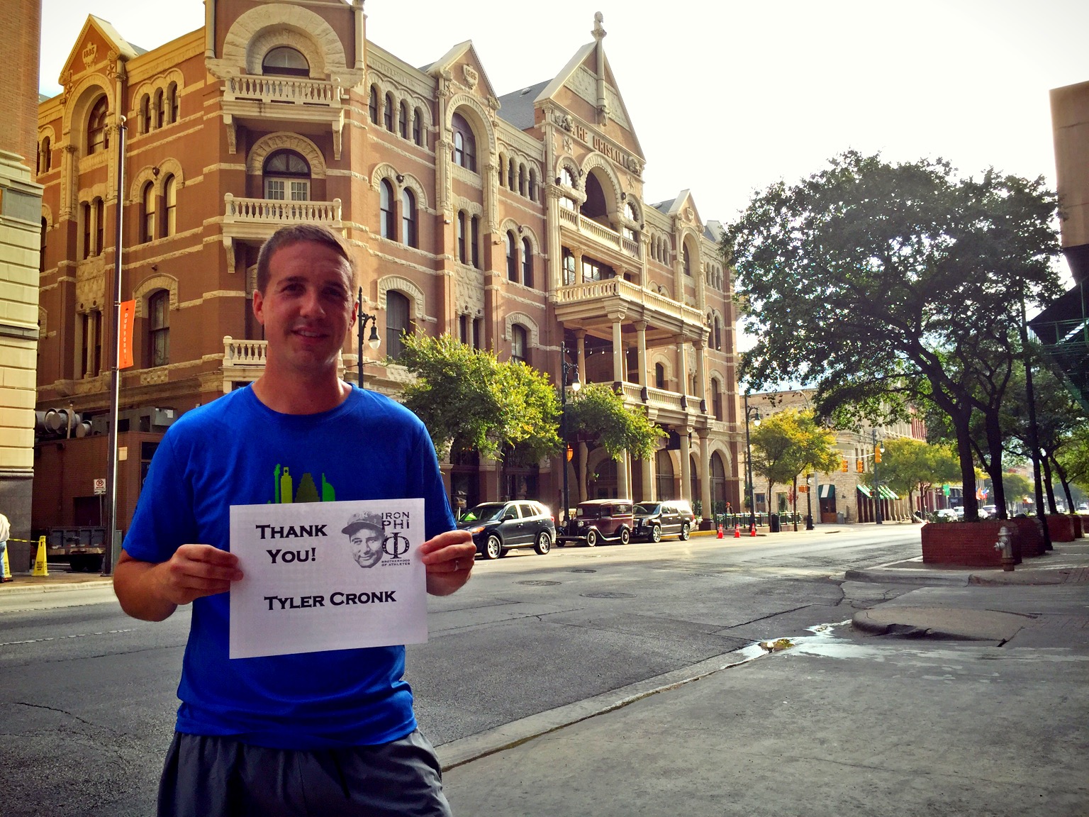 We then ran to Austin’s famous sixth street, a street that this guy can no longer handle. So rather than taking a picture in front of its establishments that cause trouble, I featured the Driskill, one of Austin’s iconic hotels. It’s a place that I probably won’t ever stay in (based on my budget), but I do have no problem taking advantage of their posh restrooms for mid-run breaks. Here, I thanked Tyler Cronk, another fellow Iowa State Phi Delt. I had the pleasure of running into Tyler last weekend, as he gave my family a lift on a hayride to the Deal Family Orchard. Random encounters are always the best. Tyler has always been gracious in supporting my effort, and he is an absolute class act.