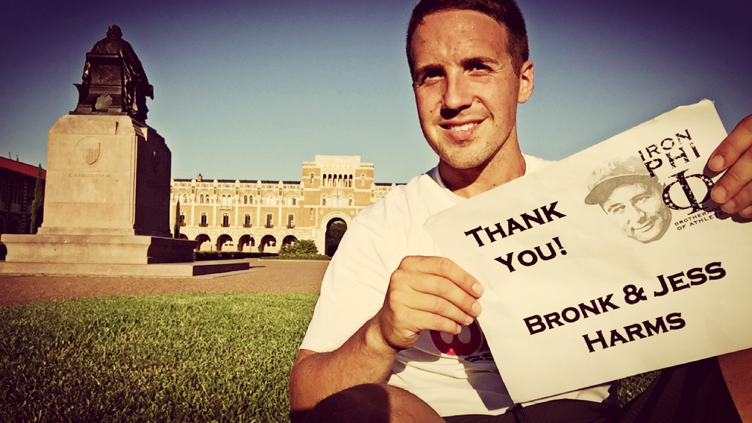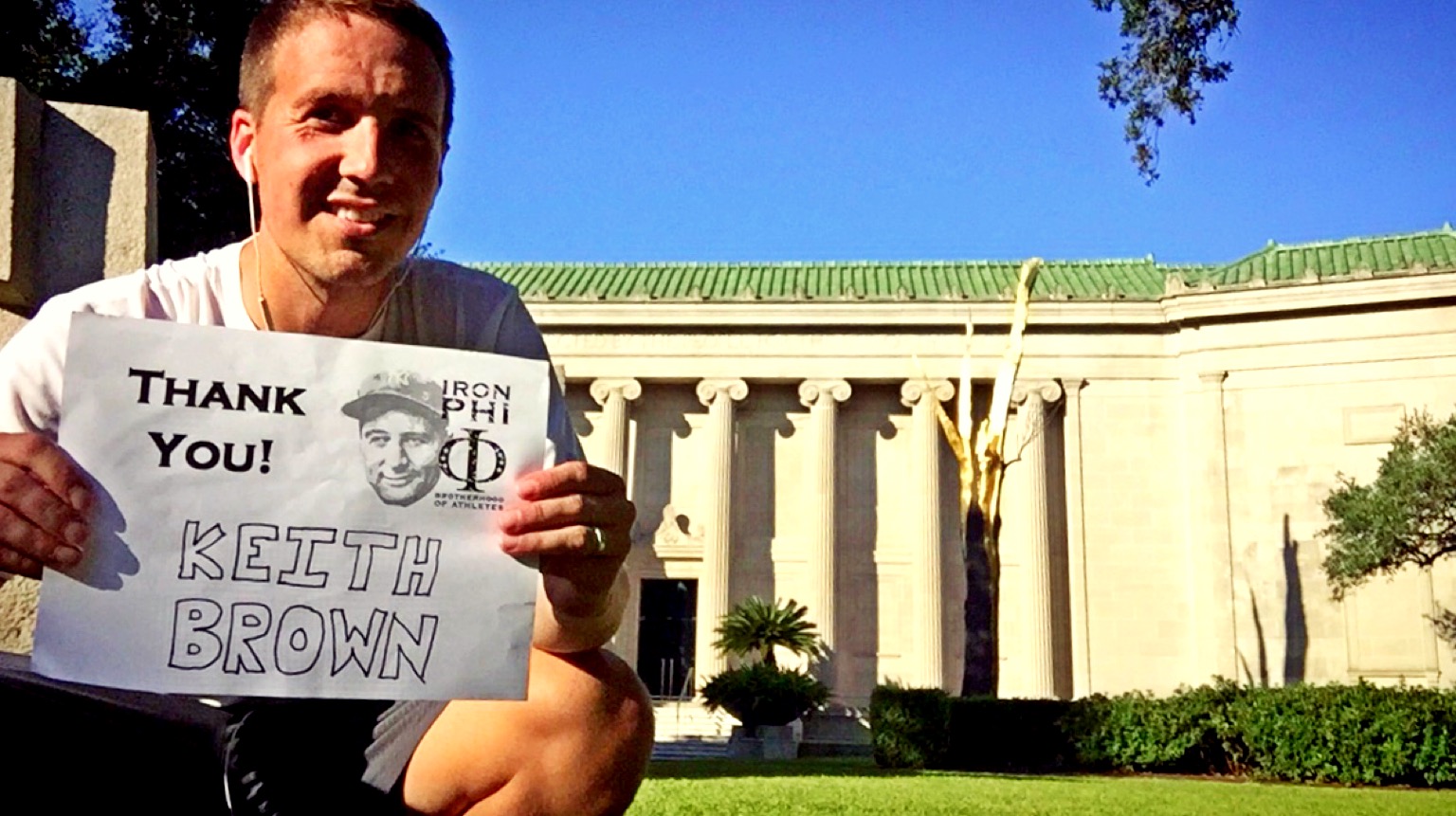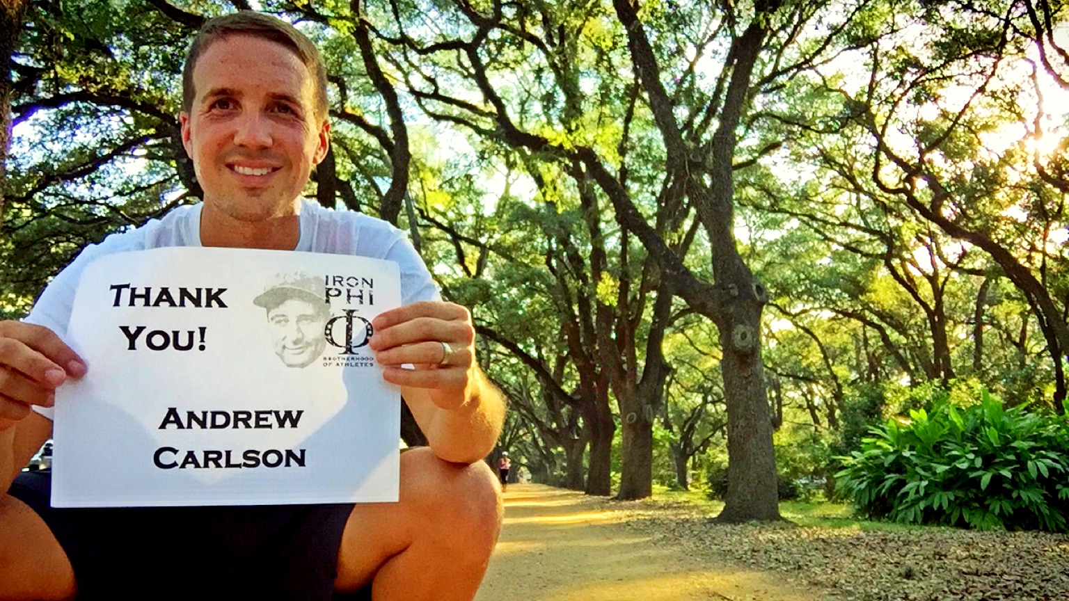 I then headed to Rice University for a few stops. All I can say about Rice is WOW! What a beautiful campus. It’s one of those places that you enter and immediately feel at peace. I definitely needed some peace after my first six miles of the day. On the edge of campus, I found an amazing running trail lined with people, dogs and trees. I thanked my colleague Andrew “Drew” Carlson here. Drew was one of my most generous supporters on this trip, and I have a number of thank yous coming for him in Baton Rouge. Drew is one fun dude. Well traveled, cultured, sharp in dress, personable and a great colleague. He’s been working to start new Phi Delt chapters across the country for the past two years and has killed it.
