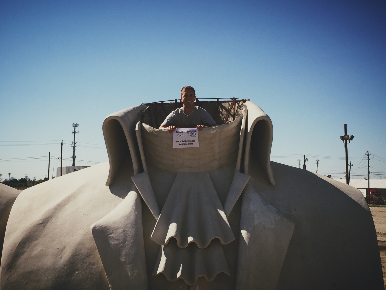 On the way to my starting point, we stopped by Adickes Sculptureworx Studio just outside of downtown to take a picture with the many U.S. Presidents’ heads that the artist has done. We soon learned that the Presidents had been transported elsewhere, but we were lucky enough to see the current display – The Beatles. I took the opportunity to thank Neil & Suzanne Alexander once again.