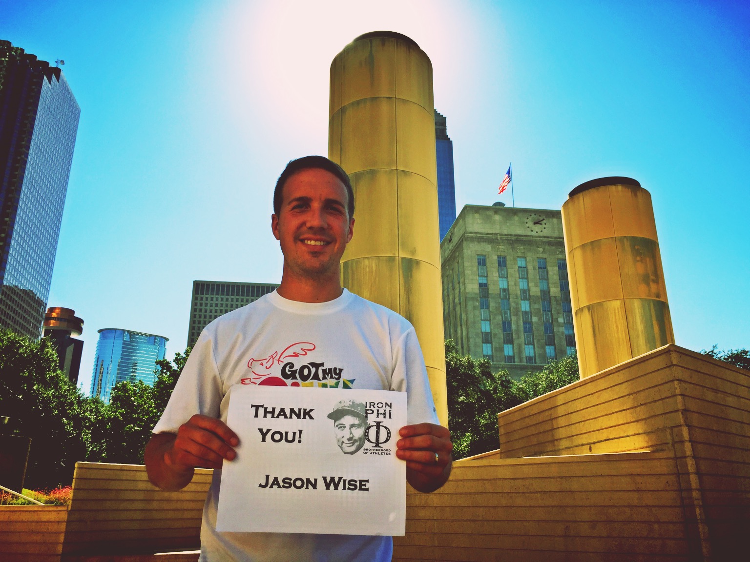 I started my run at Tranquility Park, just across the street from Houston’s City Hall. The park provided for a great shot! Here, I thanked my buddy Jason Wise for his donation. Jason and I worked at First American State Bank while I was in college, and we became good friends and share many fun bank stories. Jason works for IBM and recently moved to Ankeny, Iowa. I was able to grab lunch with him a few months ago, and I look forward to many more lunches down the road.