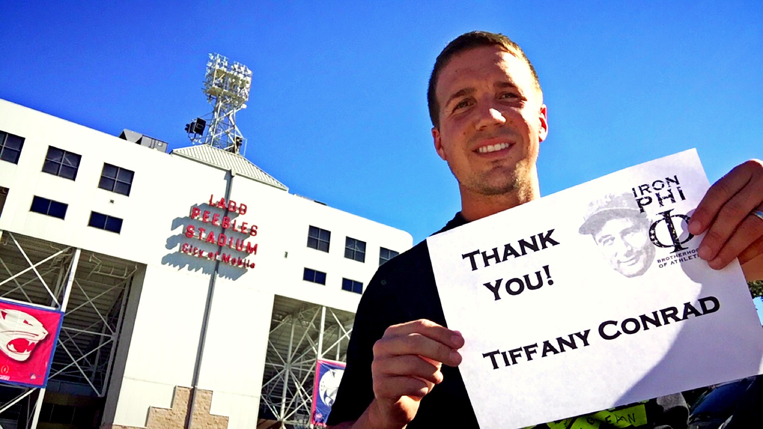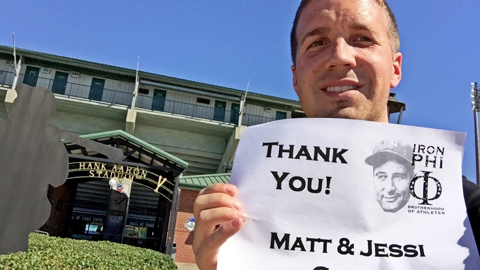 My first stop was Hank Aaron Stadium, home of the Mobile Bay Bears, a double-A affiliate of the Arizona Diamondbacks. It took me a bit to get used to my much smaller tripod, and you tell with my first picture. I thanked my cousins Matthew & Jessi Good once again. Matt is an avid baseball fan and has a great memorabilia collection. I’ve been able to thank him in front of many baseball stadiums throughout my journeys.