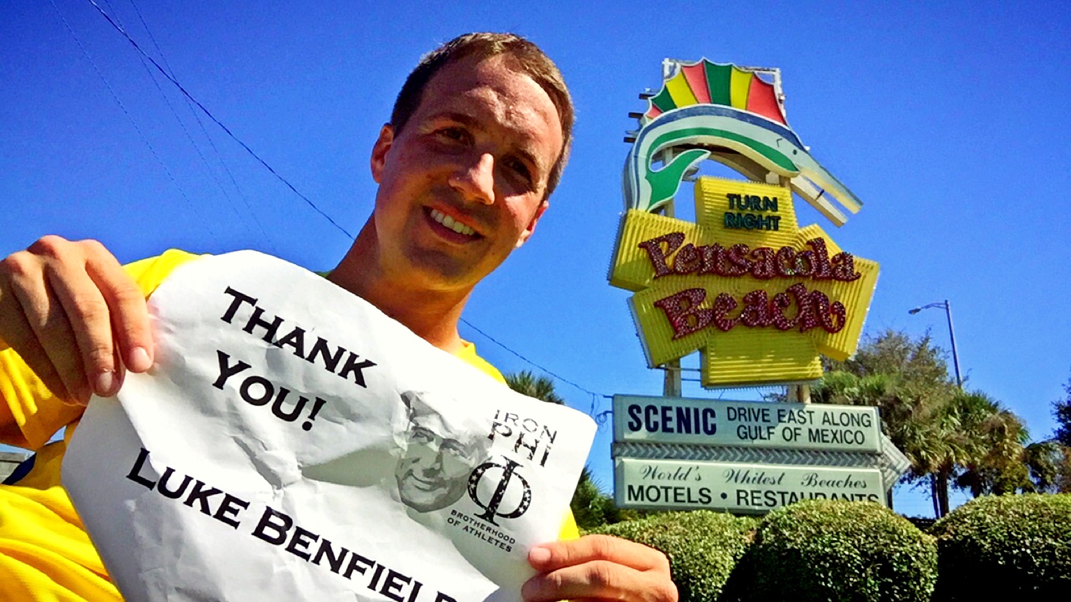 In the three years that I’ve been doing these trips, I’ve had very few moments that were truly intimidating. Many people ask me if I ever get nervous running through the “bad parts of town,” and to be honest, I don’t think I ever have. I’ve actually learned to embrace many of these areas as you can generally find very neat revitalization efforts. I’ve also learned that a smile and a head nod goes a long ways when you’re running, and that getting lost can offer many positives. But today I was intimidated. Not by an area or a person, but by a structure – Pensacola’s 3-Mile Bridge. The bridge connects Pensacola to Gulf Breeze, has a raised area in the center and offers no official pedestrian lane with a lot of traffic going 40-55 mph. I get crazy ideas, but I’m really very conservative when it comes to safety. This was a bit outside of my comfort zone. I found a nice vantage point that captures the length of the bridge. The bridge runs the waterline, and you can see the raised area a bit. Here, I thanked Doug Wiles, a Phi Delta Theta regional volunteer, a proud Floridian and a Florida Gator. Doug is one of the nicest and pleasant men that I know. He always wants to help. I saw Doug twice this year, once in Jacksonville and once in Las Vegas.