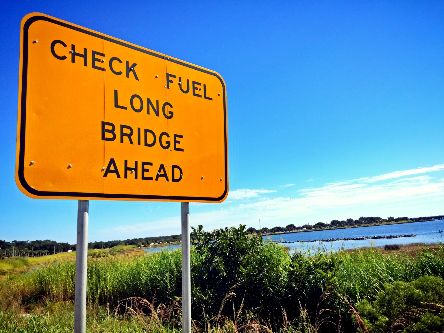 As my nerves began to build a bit running to the bridge, this sign didn’t help. My fuel was on a quarter tank, but I knew I’d be good.