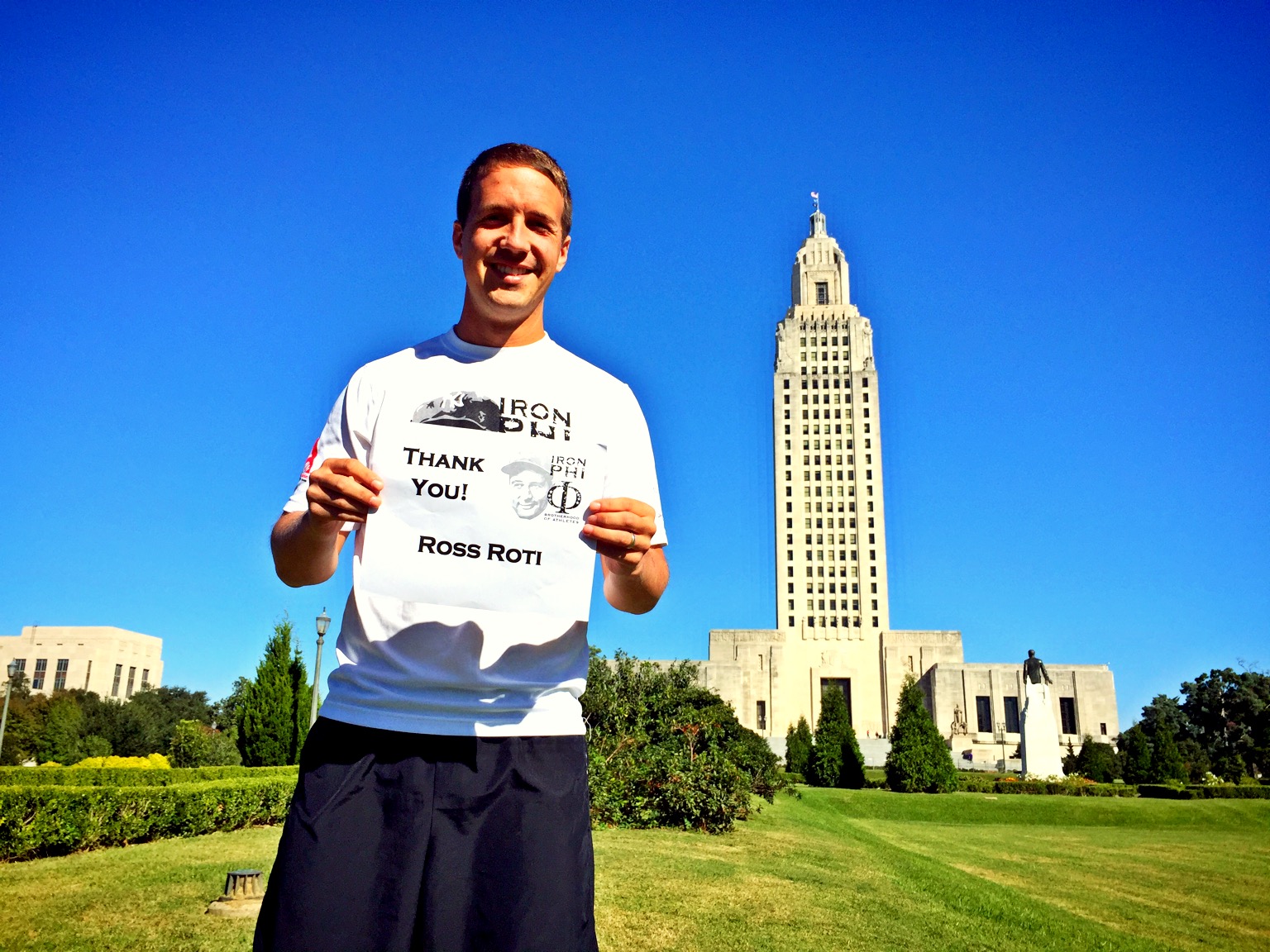 We then drove David’s car into downtown Baton Rouge where we would start our run. The start point for the day was the Louisiana State Capitol building, the tallest capitol in America. While impressive, I heard a few grumbling from Louisianans throughout the day about how the old capitol building is the fan favorite in town. We passed it later during the run, and it was easy to see why they have those thoughts. I thanked Ross Roti for the final time during the trip.