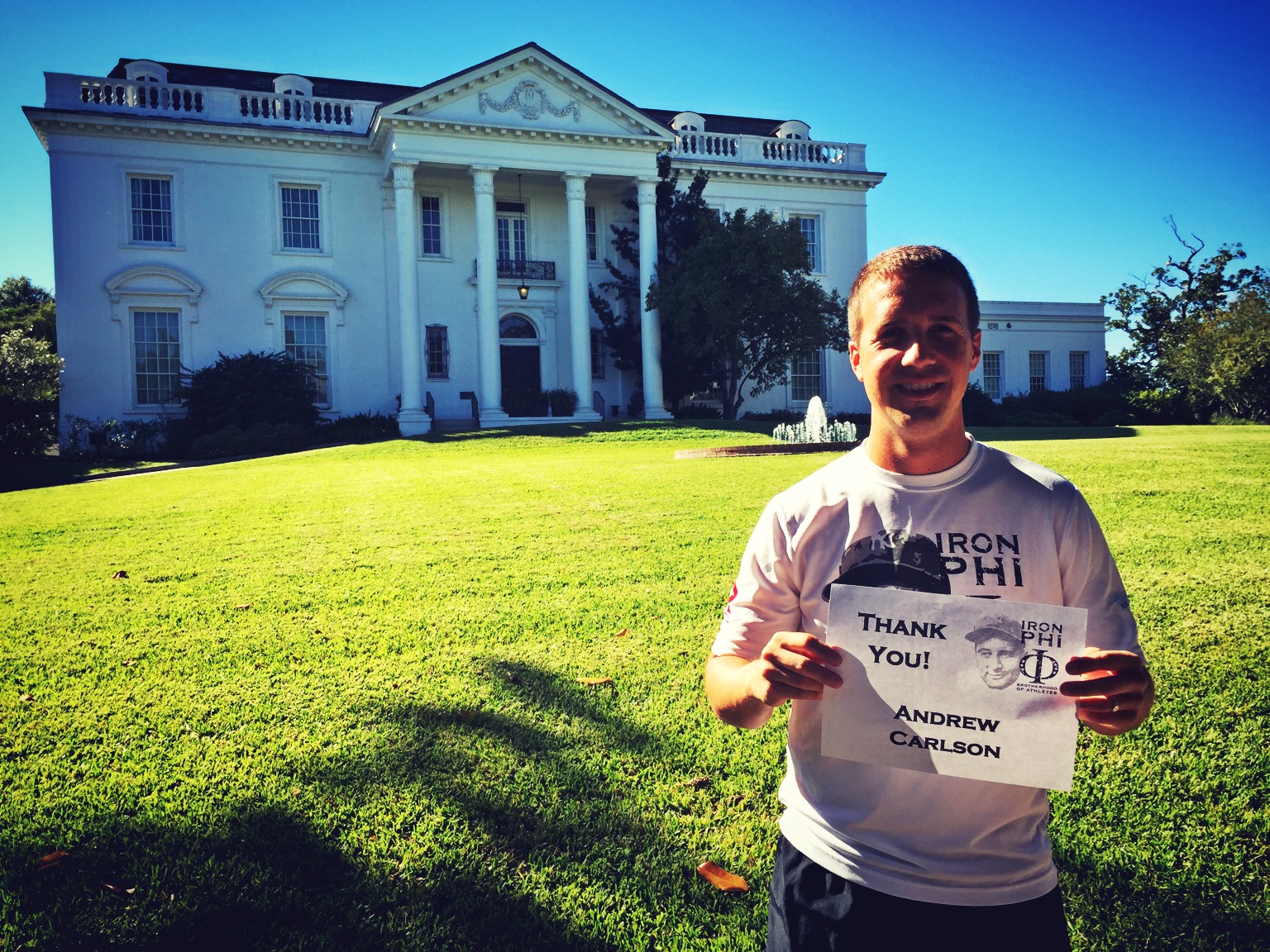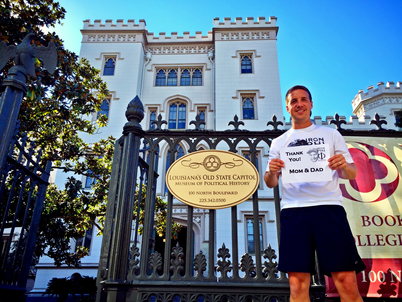 Just down the road from the Old Capitol Building was the Old Governor’s Mansion. I quickly learned that everything in Baton Rouge that is prefaced with the word “old” is quite impressive. Here, I thanked my colleague Andrew Carlson. Drew’s donation covered all stops in Baton Rouge, but he was gracious enough to let me put other names on landmarks with my influx of donors. I was scheming up something special for him throughout the day, and the perfect opportunity presented itself that night.