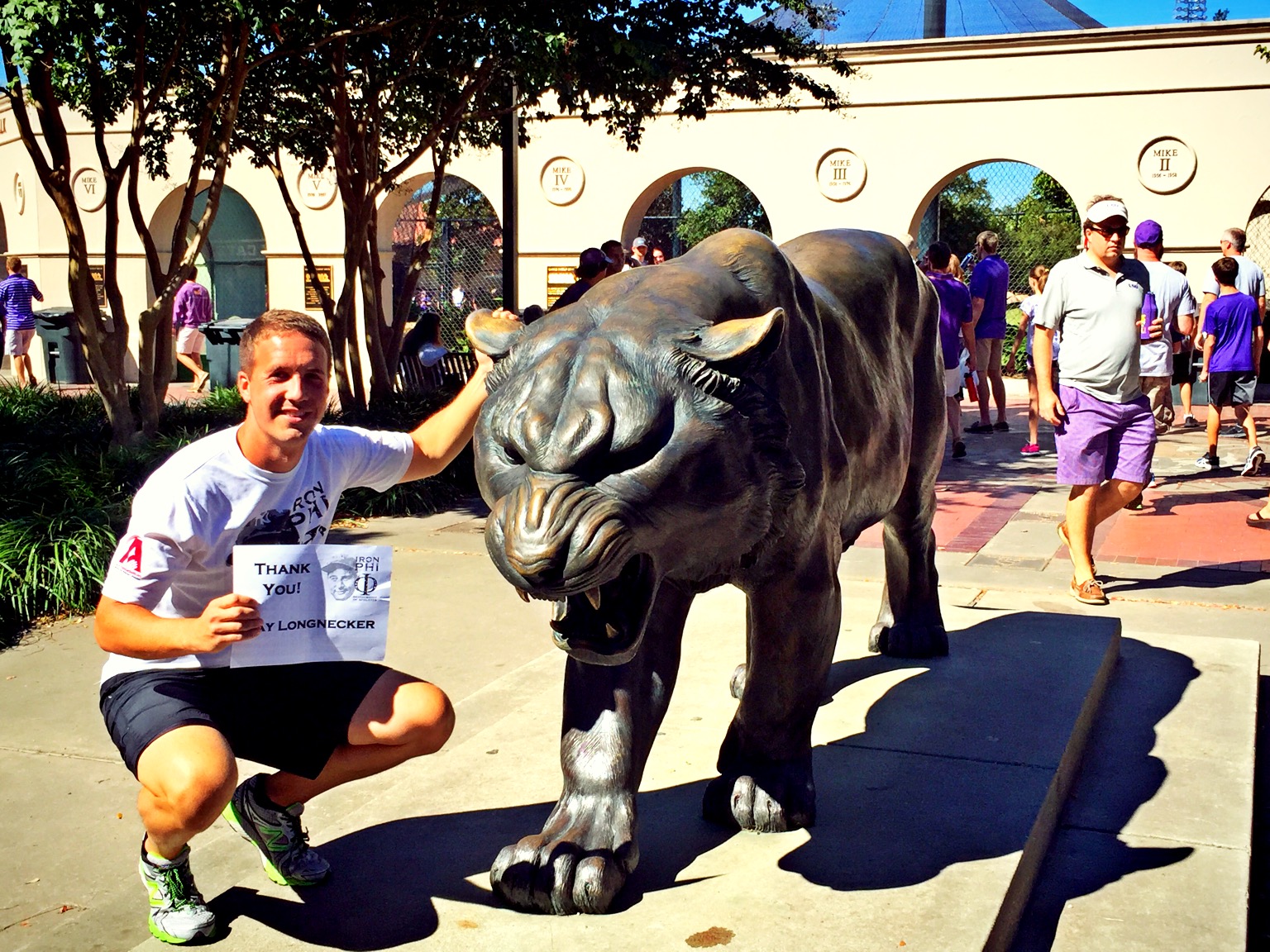 Just outside the stadium lives Mike The Tiger, LSU’s live mascot and probably the most pampered tiger in the world. Construction on the current tiger enclosure began in November 2004 and was completed in August 2005. The habitat incorporates natural substrates, including grass, and also includes elements of LSU’s renaissance architecture and facts educating Mike’s visitors on the six living subspecies of tigers. The new enclosure encompasses 13,000 square feet. Mike’s home is nearly nine times the size of mine! We actually didn’t get to see Mike, but I grabbed a picture in front of his statue. We also chatted with a few LSU fans who for some reason told us about the great quality of the town’s water. They referenced being the #2 water in the nation. I think that they were surprised that I knew the #1 city – Ames, Iowa! I told them to Google it and watch our amazing promo video for a few laughs. Here, I thanked fellow Iowa State Phi Delt Jay Longnecker. Jay and I both advise the Phi Delt chapter at ISU and have become great friends. A passionate Cyclone fan, Jay is a man who I can always count on. A passer-by said “Who’s Jay Longnecker?” My only response was “one great dude.”