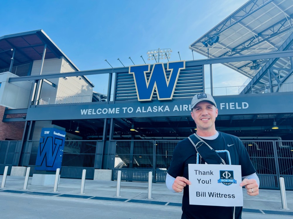 We then entered the University of Washington’s campus for a few donor stops. The UW campus is beautiful and a classic college campus, bustling with activity and students coming and going from classes. Our first stop was Husky Stadium, the home of the UW football team. Husky Stadium has long been recognized as one of the loudest stadiums in the nation. This is in part due to the stadium’s design; almost 70% of the seats are located between the end zones, covered by cantilevered metal roofs that trap the sound. It’s an impressive structure, and I thanked Bill Wittress again for his donation.