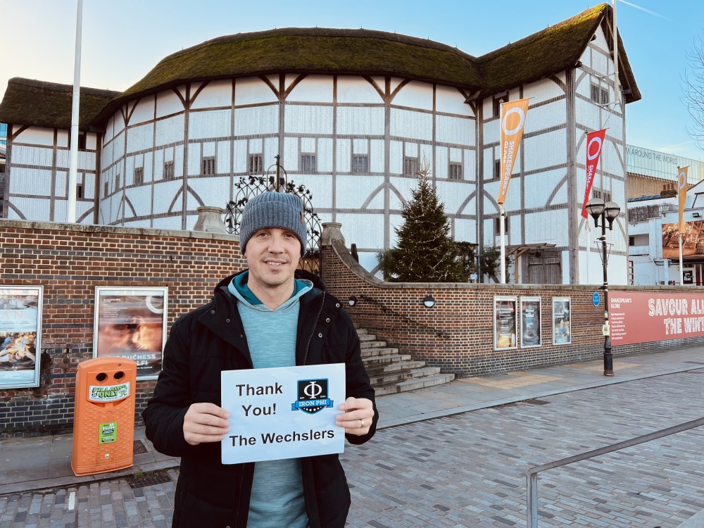 We walked through the South Bank neighborhood towards the river and reached the famous Globe Theatre, made famous by that guy they called Shakespeare. At the Globe, I thanked Joe & Sarah Wechsler and family for their donation. Joe, my brother from another mother, recruited me to be on the Phi Delt staff back in 2004, and I’ll be forever grateful to him. My family joined his family on an epic RV trip west a few years ago. My favorite thing about Joe is that he makes my crazy decisions seem tame. Like that time he randomly moved to Lake Placid, tried out for the U.S. Olympic skeleton team, and damn near almost made it.
