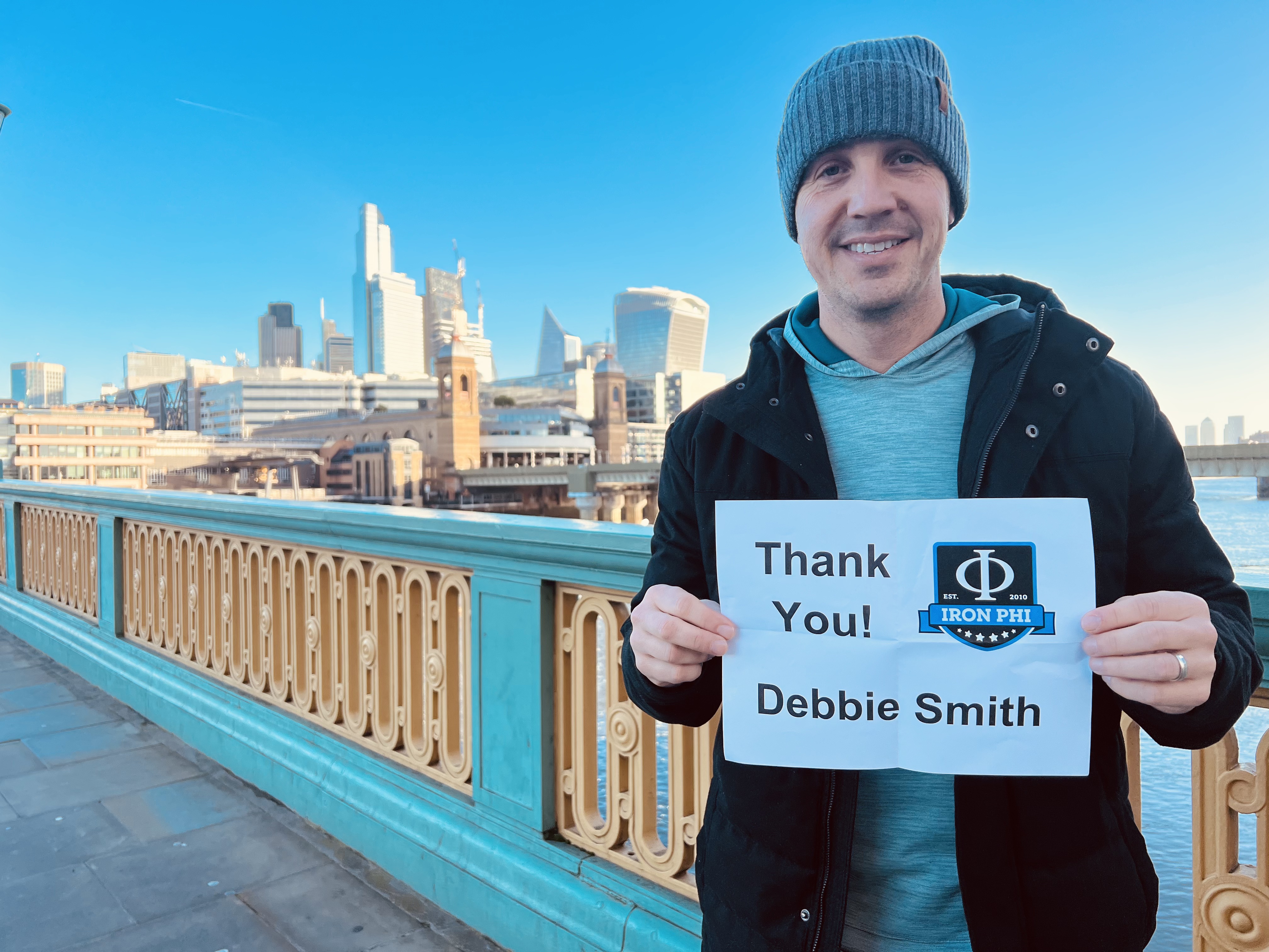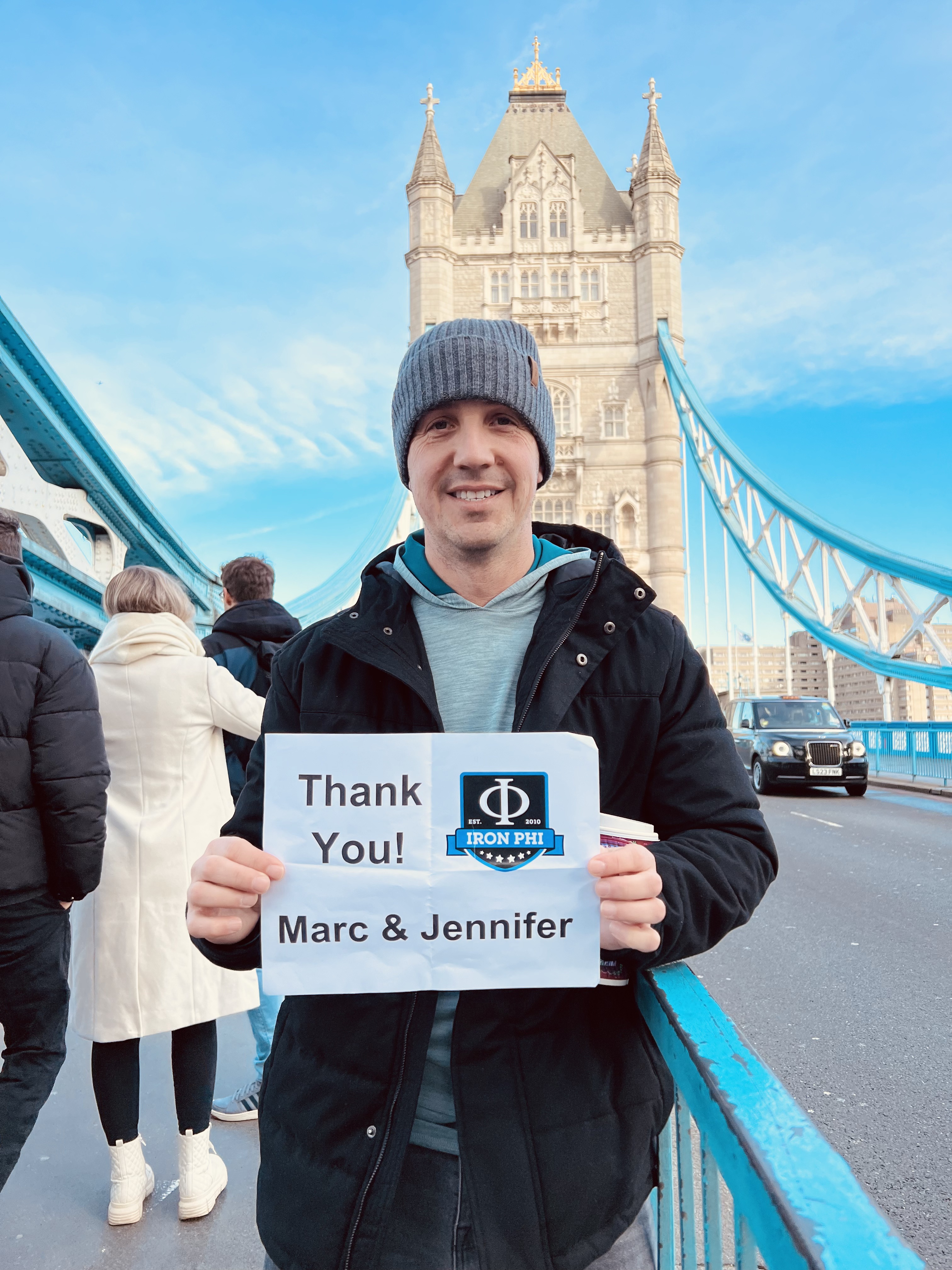 I made a London rookie mistake with my thank you signs. It’s easy to confuse the Tower Bridge and the Tower of London as they have similar names are in the same area. I pulled out my Tower of London thank you sign but thanked Josh Ehlen with the Tower Bridge in the background. Whoops! In any case, it’s a great shot, for a great guy, that Josh Ehlen. A fellow runner (a much better runner than me I must add), I’ve always admired Josh’s charisma and work ethic. It wouldn’t surprise you that he’s a former wrestler too.